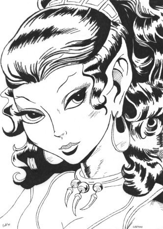 The drawing I made of Leetah, in 1995, after an image in Fire and Flight. It is basically okay, except that the left side of her face (for us) is too wide. The curls were an absolute horror, by the way, even if I did copy them.